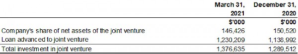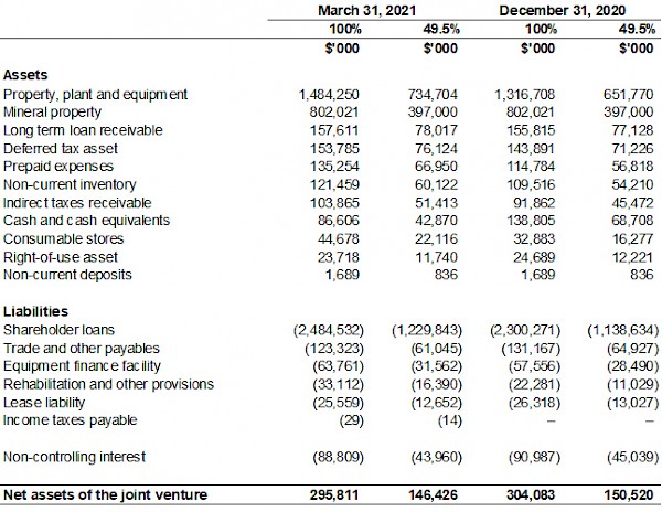 The company’s investment in the Kamoa Holding joint venture increased by $87.1 million from $1,289.5 million as at December 31, 2020, to $1,376.6 million as at March 31, 2021, with each of the current shareholders funding the operations equivalent to their proportionate shareholding interest. The company’s portion of the Kamoa Holding joint venture cash calls amounted to $70.0 million during the three months ended March 31, 2021, while the company’s share of losses from the joint venture amounted to $4.1 million.