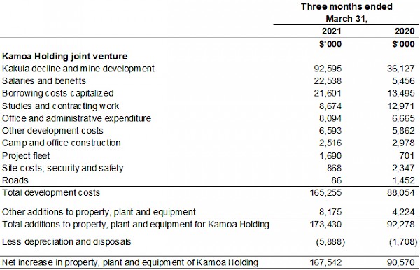 The Kamoa Holding joint venture’s net increase in property, plant and equipment from December 31, 2020, to March 31, 2021, amounted to $167.5 million and can be further broken down as follows: