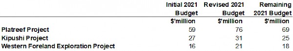 Ivanhoe’s board of directors allocated increased 2021 budgets to each of the Platreef, Kipushi and Western Foreland’s exploration projects. The budget increases and amounts remaining for the remainder of 2021 are set out in the following table: