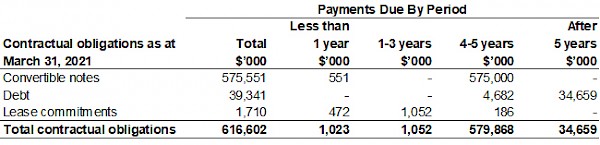 The company’s total liabilities increased by $537.2 million to $617.8 million as at March 31, 2021, from $80.6 million as at December 31, 2020, with the increase also due to the private placement offering of $575.0 million of 2.50% convertible senior notes described above.