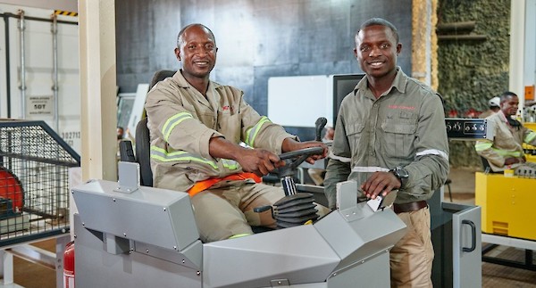 Muhemba Richard (left), operating an ore-truck simulator under the guidance of trainer Kasongo Kabila at Kamoa Copper’s state-of-the-art training centre.
