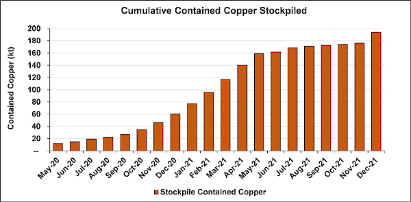 Chart 3: Cumulative tonnes and grade of contained copper in surface stockpiles from May 2020 to December 31, 2021.