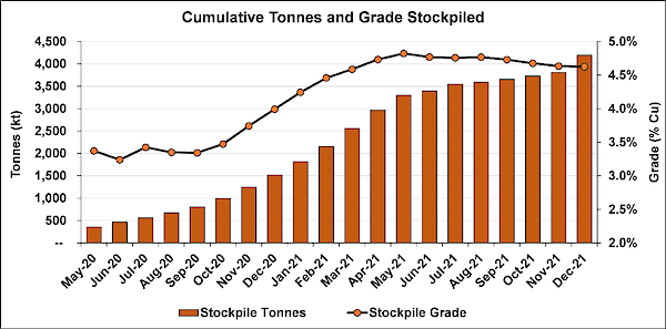 The project’s surface stockpiles now contain approximately 4.19 million tonnes of high-grade and medium-grade ore at an estimated, blended average of 4.63% copper. Contained copper in the stockpiles at the end of December now totals more than 194,000 tonnes (the current copper price is approximately $9,600 per tonne).