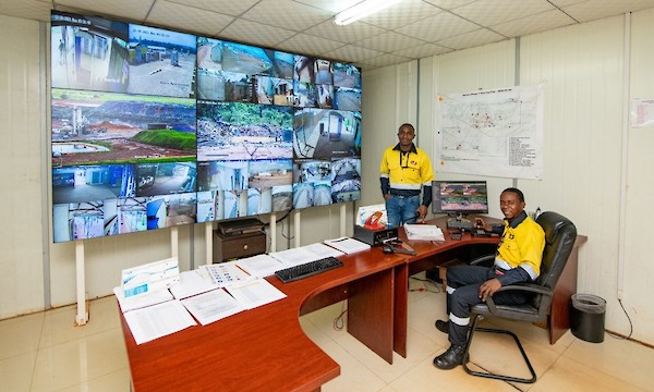Boris Kitupa, Security Supervisor (left), and Philo Nsenga, Security Controller, monitoring security cameras in the Kakula North control room.