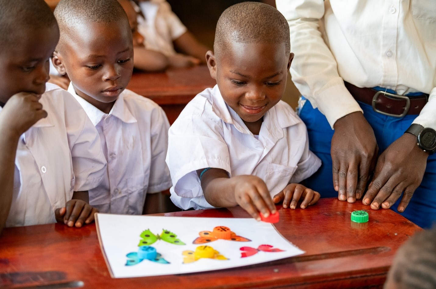 Local learners at the Kaponda Primary School near Kamoa-Kakula using learning materials made from reused materials in the Bouchon Bijou volunteer project.