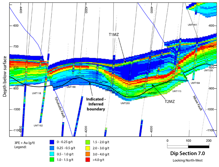 The T1MZ 2.0 g/t 3PE+Au grade shell has an average true thickness of 3.9 metres for the Indicated Mineral Resource area and 3.8 metres for the Inferred Mineral Resource area. The T2MZ 2.0 g/t 3PE+Au grade shell has an average true thickness of 19 metres for the Indicated Mineral Resource area and 15 metres for the Inferred Mineral Resource area. The TCU T2MZ also demonstrates significant concentration of the highest grade near the top of the mineralized zone (“top loading”) and continuity of grade at elevated cut-offs that could allow for more selective mining scenarios. This is illustrated in figures 4 and 5.