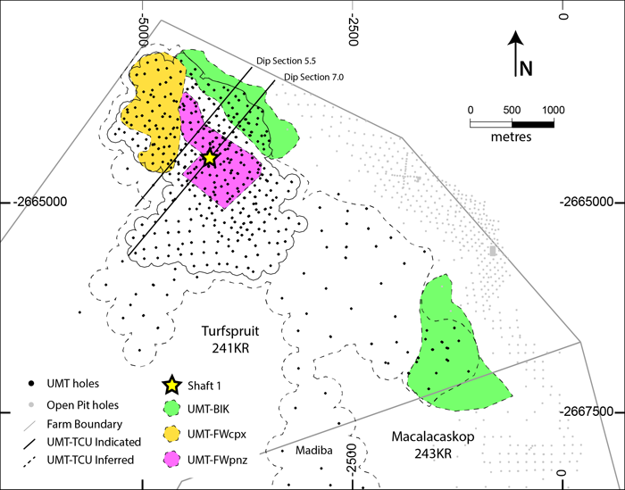 Figure 2: Plan view showing location of the new resource areas relative to Shaft 1. Bikkuri Mineral Resources (UMT-BIK) is shown in green; the two separate domains of Footwall Mineral Resources (UMT-FW) are shown in orange (UMT-FWcpx) and purple (UMT-FWpnz).
