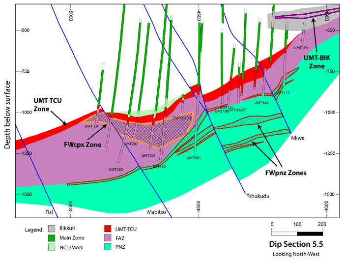 Figure 6: Section Line 5.5 showing the Turfspruit Cyclic Unit (TCU), shown in red, which hosts the majority of the Flatreef Mineral Resources, and also the additional underground zones of mineralization – the Footwall FWcpx shown in purple with cross hatches, the FWpnz, shown in green with diagonal lines and the Bikkuri (BIK), shown in gray – that occur in close proximity to the TCU.