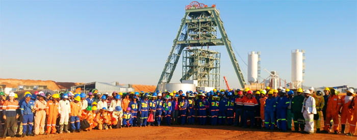 Platreef’s Shaft 1 head gear provides backdrop for a gathering of project team membersand contractors.