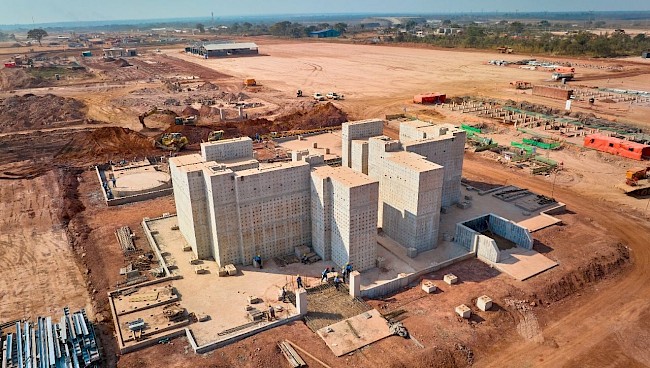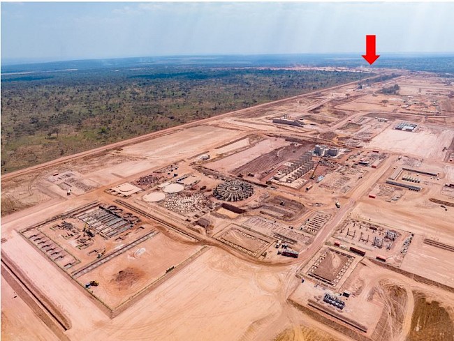 Aerial view of the construction progress for the Phase 3, 5-million-tonne-per-annum concentrator. The new concentrator will be fed by ore from the Kamoa 1 and Kamoa 2 underground mines, which are accessed by the new box cut visible in the background (red arrow). The Phase 3 expansion is well on track for first production in Q4 2024.