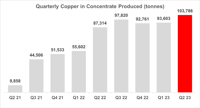 Kamoa-Kakula reports record quarterly production of 103,786 tonnes of copper during the second quarter of 2023, compared with 93,603 tonnes of copper in the first quarter.