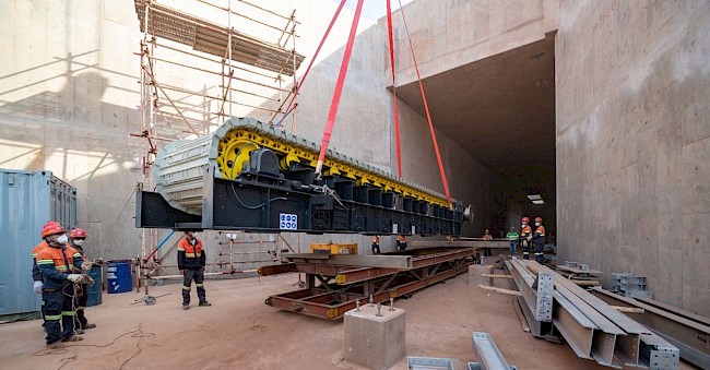 Kamoa-Kakula Phase 3 concentrator surface crew lift a 28-tonne apron feeder into position on a trolley frame.