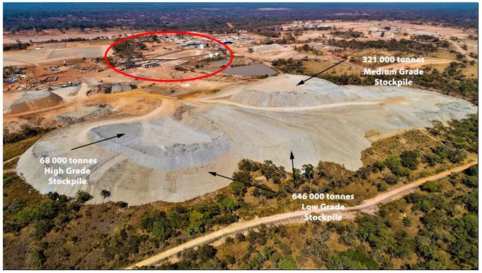 Aerial view of the Kakula Mine showing the tonnes and grade of the main pre-production stockpiles. The northern declines and ore conveyor system are circled in red and the processing plant is in the upper right corner.