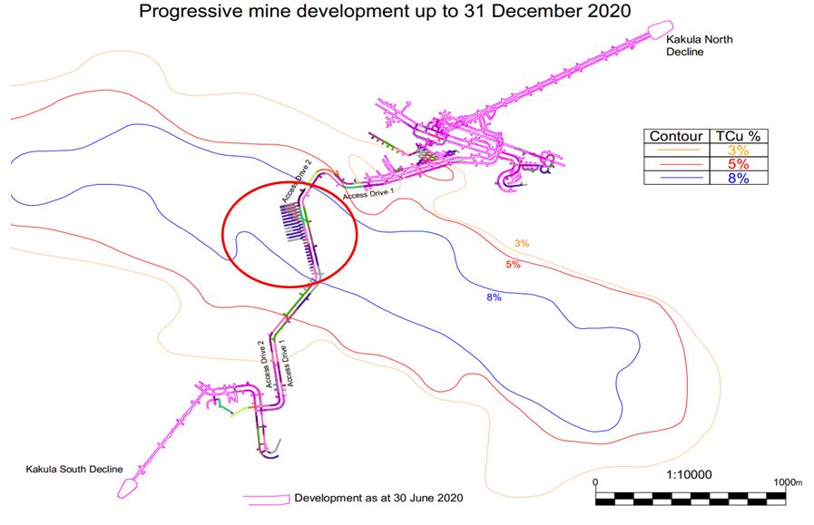 Figure 3: Underground development completed to the end of June (in purple) and scheduled mine development over the three months ending December 31, 2020. Majority of the development during this period will be in the initial drift-and-fill mining area (circled in red) within Kakula’s high-grade zone (+8% copper).