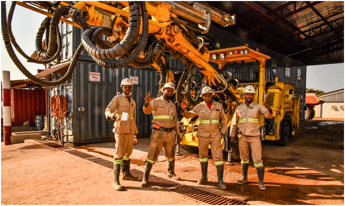 Kakula’s team members (L-R) Timothe Kabeya, Jean Luc Kadita, Epwila Kundjuka, Nkulu Nsungu with one of the project’s newly commissioned Epiroc 282 double-boom, semi-autonomous drill rigs.