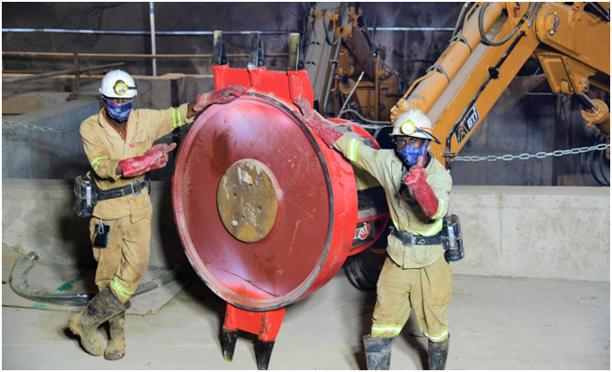 Mioi Kabinda (left) and Kifumbe Bijimba (right) with the newly-installed magnet and rock breaker at the east ore tip bin, part of the underground ore handling system at the Kakula Mine.