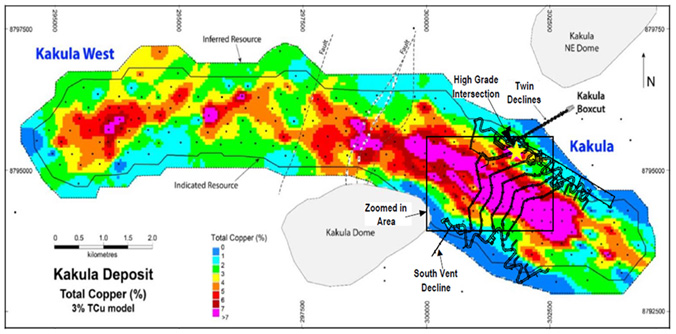 Figure 1: The 13.3-kilometre-long Kakula Deposit showing the first five years of planned underground development and production (in the black box at the eastern end of the deposit) focused on the pink area containing average copper grades greater than 8% copper.
