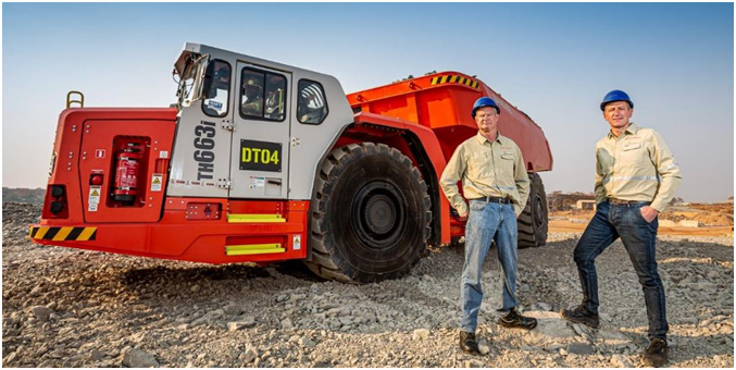 Mark Farren, Kamoa Copper’s Chief Executive Officer (left), and Rochelle De Villiers (right), Kamoa Copper’s Co-Chief Financial Officer, with one of the mine’s new Sandvik 63-tonne haul trucks. Mr. Farren and Mr. De Villiers are key members of the mine’s on-site management team driving the project towards completion.