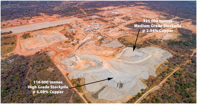 Aerial view of the Kakula Mine showing the tonnes and grade of the main pre-production stockpiles. The high-grade stockpile currently contains approximately 116,000 tonnes grading 6.08% copper, and the medium-grade stockpile currently contains approximately 325,000 tonnes grading 2.94% copper.