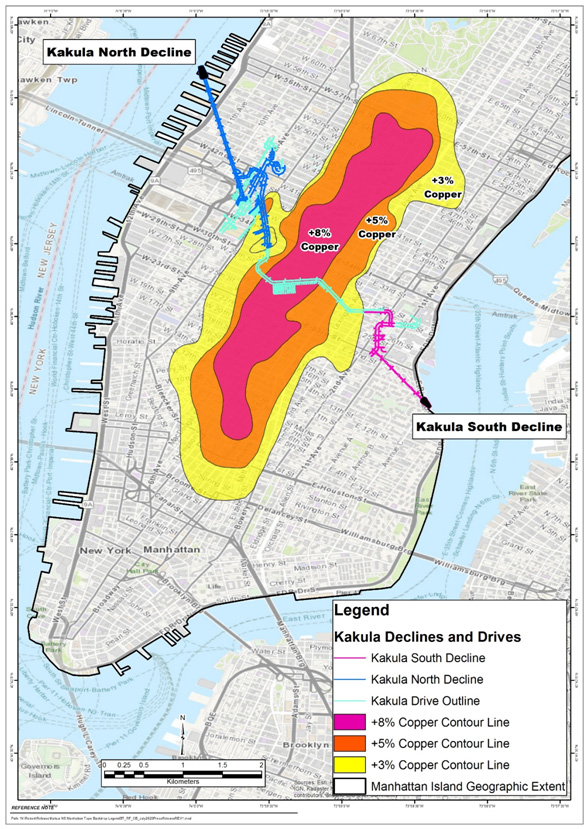 Figure 4: The eastern portion of Kakula Mine ─ representing less than half of the overall 13.3-kilometre-long Kakula Deposit ─ overlain on southern Manhattan Island to give a sense of the enormous scale of the underground operations.