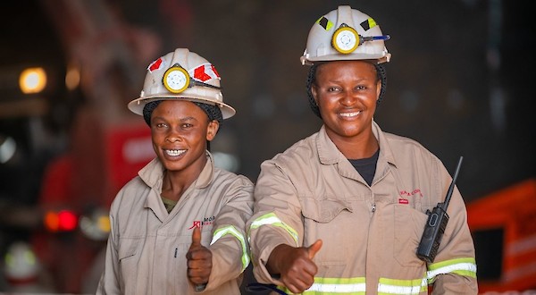 Gracia Maseka, General Worker; Kamin Hortense, Dump Truck Operator; standing at the portal entrance to the twin Kamoa 1 and 2 declines.