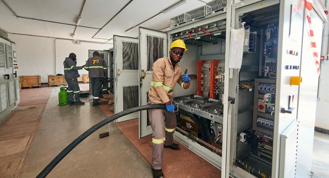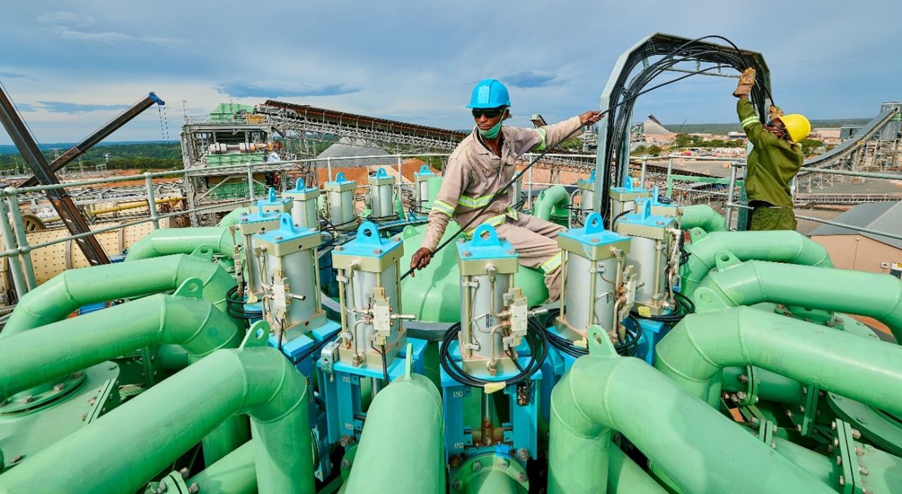 Mardoche Muswamba (left) and Kakeya Tshidjamba installing electrical wiring to the pneumatic control valves on the Phase 2 primary mill cyclones. More than 75% of the Phase 2 instruments have been installed.