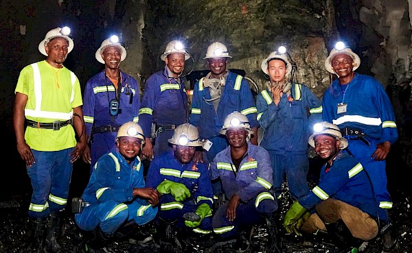One of Kakula’s high-performing mining crews. Top row (left to right): Mike Ilunga, Aliday Mujinga, Elize Nkulu, Ebrahim Tshikala, Liu Huang and Jean Paul Ndayi. Bottom row: Eric Kaut, Seriphin Lupitshi, Lazare Ilunga and Didier Kaona.
