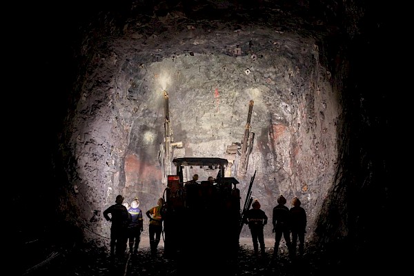 Miners operating a jumbo drill at the face of a high-grade development drift near the centre of the Kakula Mine. Due to the thickness of the copper ore in this area, the drifts are 10 metres high by 7.5 metres wide (32.8 feet high by 24.6 feet wide), or 75 square metres. For perspective, the height of the drift is close to the height of a standard telephone pole. The average grade of ore in this area is 8.75% copper and the tonnage per blast is approximately 1,000 tonnes, more than double the tonnage per blast in a normal drift.