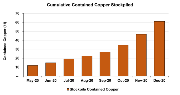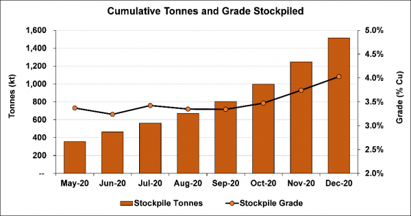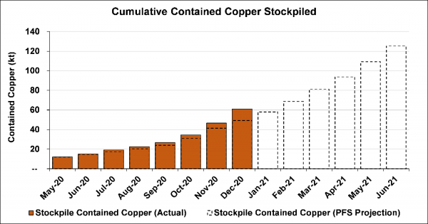 The project is on track to have approximately three million tonnes of high-grade and medium-grade ore stockpiled on surface, holding more than 125,000 tonnes of contained copper, prior to the planned start of processing in July 2021.