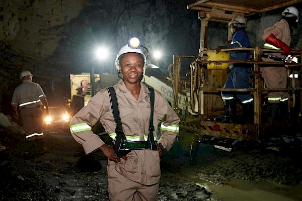 Dianne Lukenda, trainer, with a cable-anchor installation team at the Kansoko Mine.
