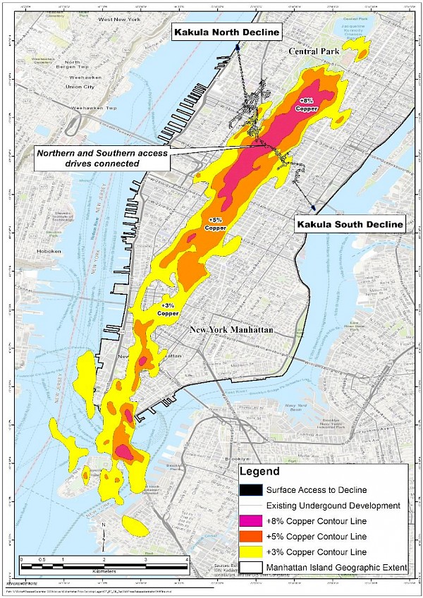 Figure 1: The overall 13.3-kilometre-long Kakula Deposit overlain on southern Manhattan Island to provide a sense of the scale of the deposit.