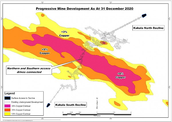 Figure 2: Underground development completed at Kakula Mine to December 31, 2020 (in black).