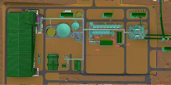 A 3D, overhead illustration of the finished Phase 1, 3.8-Mtpa concentrator plant. The picture