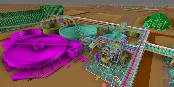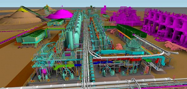 A 3D illustration of the finished ball mills area for the Phase 1, 3.8-Mtpa concentrator, with the next two ball mills for the recently-initiated Phase 2 concentrator plant shown in magenta. The picture