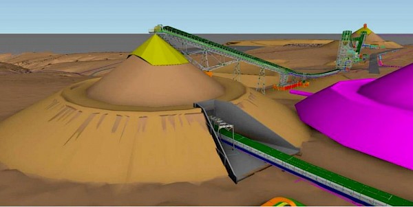 A 3D illustration of the initial high-pressure-grinding-rolls (HPGR) stockpile, with the recently-initiated second HPGR stockpile shown in magenta. The picture immediately below shows the currentconstruction progress.