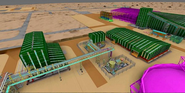 A 3D illustration of the reagent storage building,bagging plant and concentrate storage building, with Phase 2 shown in magenta. The picture immediately below shows the currentconstruction progress.