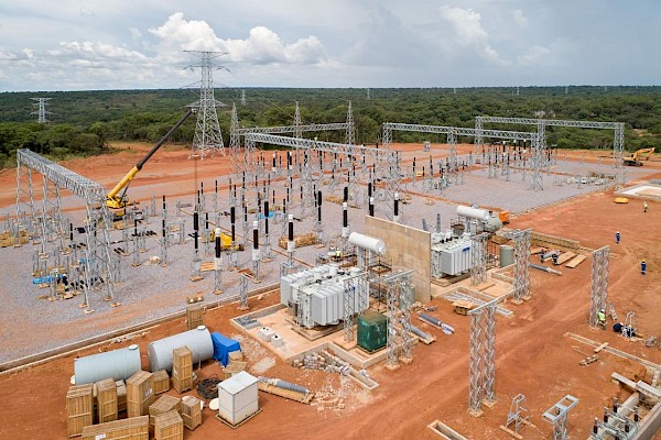 Kakula’s main electrical substation and several of the 220-kV power line transmission towers connecting the substation to the national power grid.