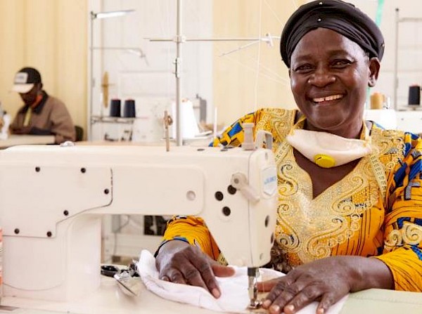 SeamstressProsperine Kazadimake sewing new Kamoa Copper uniforms at the Kamoa Sewing Project, another Kamoa-Kakula Sustainable Livelihoods project.
