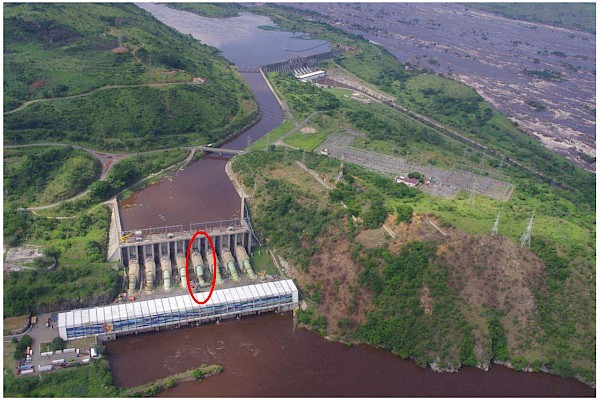 Aerial view of the Inga I (rear) and Inga II (front) hydropower plants on the Congo River. The penstock funneling water to turbine 5 at Inga II is circled in red.