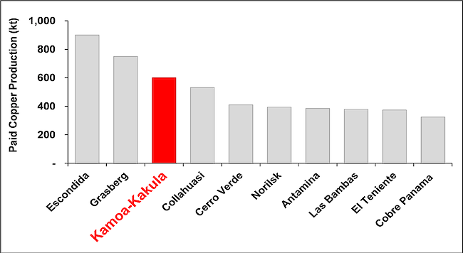 Figure 1: Kamoa-Kakula’s base-case, pro-forma Phase 3 copper production (after Phase 1 and 2 de-bottlenecking is complete) relative to the world’s projected top 10 producing mines in 2022 by paid copper production.