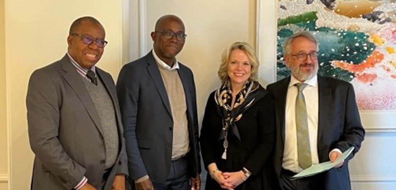 Signing of the Turbine #5 EPC contract in Heidenheim, Germany, on April 26, 2022. (L-R) Jean-Bosco Kayombo, CEO, SNEL; Ben Munanga, General Manager, Ivanhoe Mines Energy; Heike Bergmann, Senior VP Sales, Africa, Voith Hydro; Gerhard Seyrling, President and CEO, Voith Hydro Europe