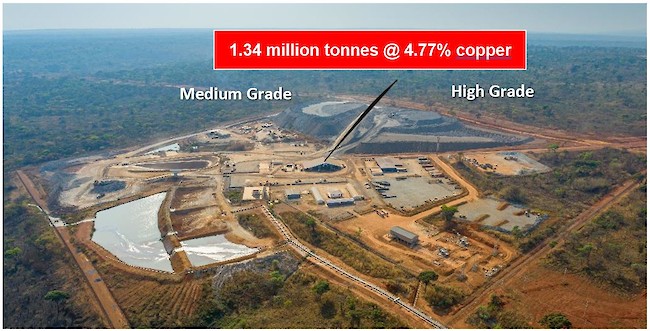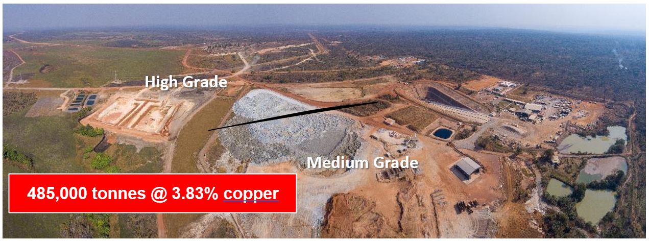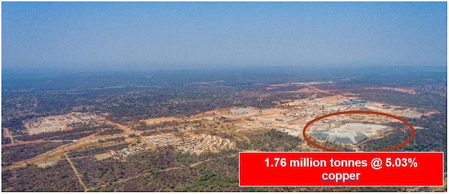 Aerial view of the Kansoko Mine and ore stockpiles containing a combined 485,000 tonnes grading 3.83% copper (consisting of 142,000 high-grade tonnes @ 5.88% copper and 343,000 medium-grade tonnes @ 2.98% copper).