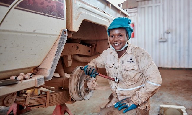 Mechanic Gretta Lusa Ngoie repairing a wheel at the Kakula Mine.