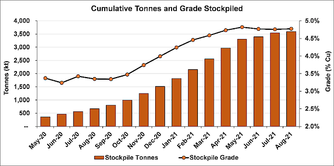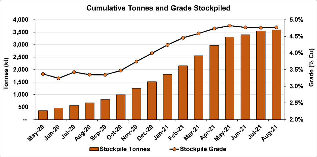Surface ore stockpiles continue to grow; now hold 3.59 million tonnes grading 4.77% copper, containing more than 171,000 tonnes of copper