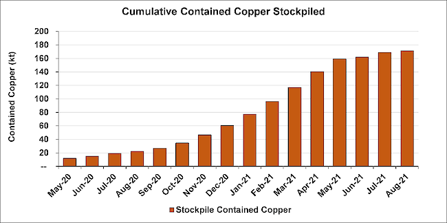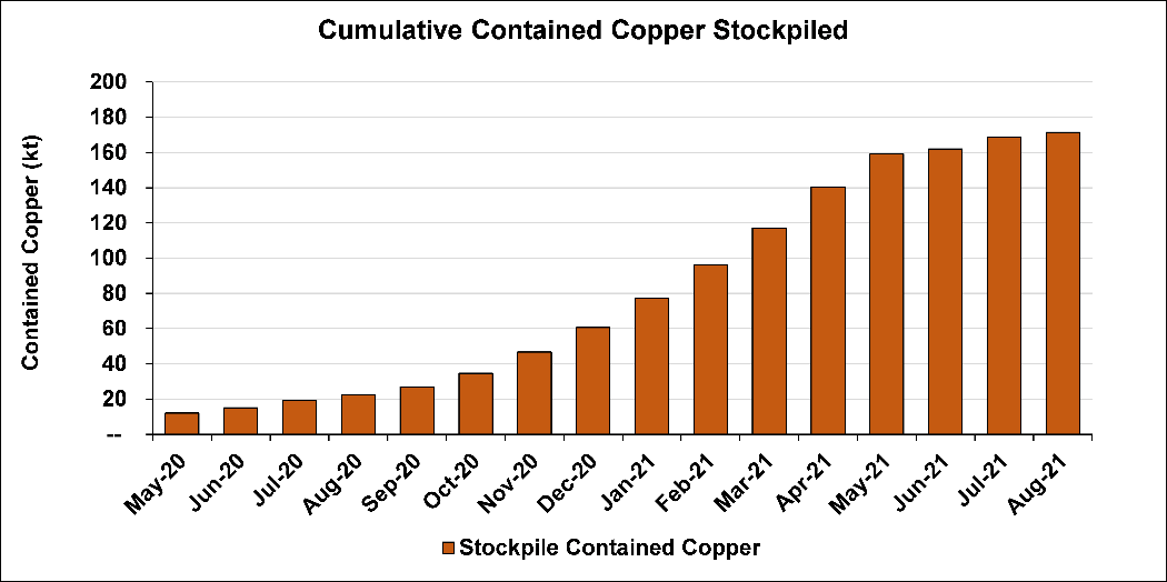The project’s surface stockpiles now contain approximately 3.59 million tonnes of high-grade and medium-grade ore at an estimated, blended average of 4.77% copper. Contained copper in the stockpiles at the end of August now totals more than 171,000 tonnes (the current copper price is approximately US$9,400 per tonne).