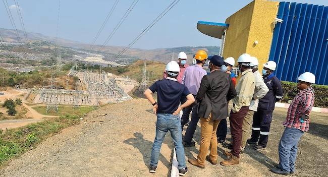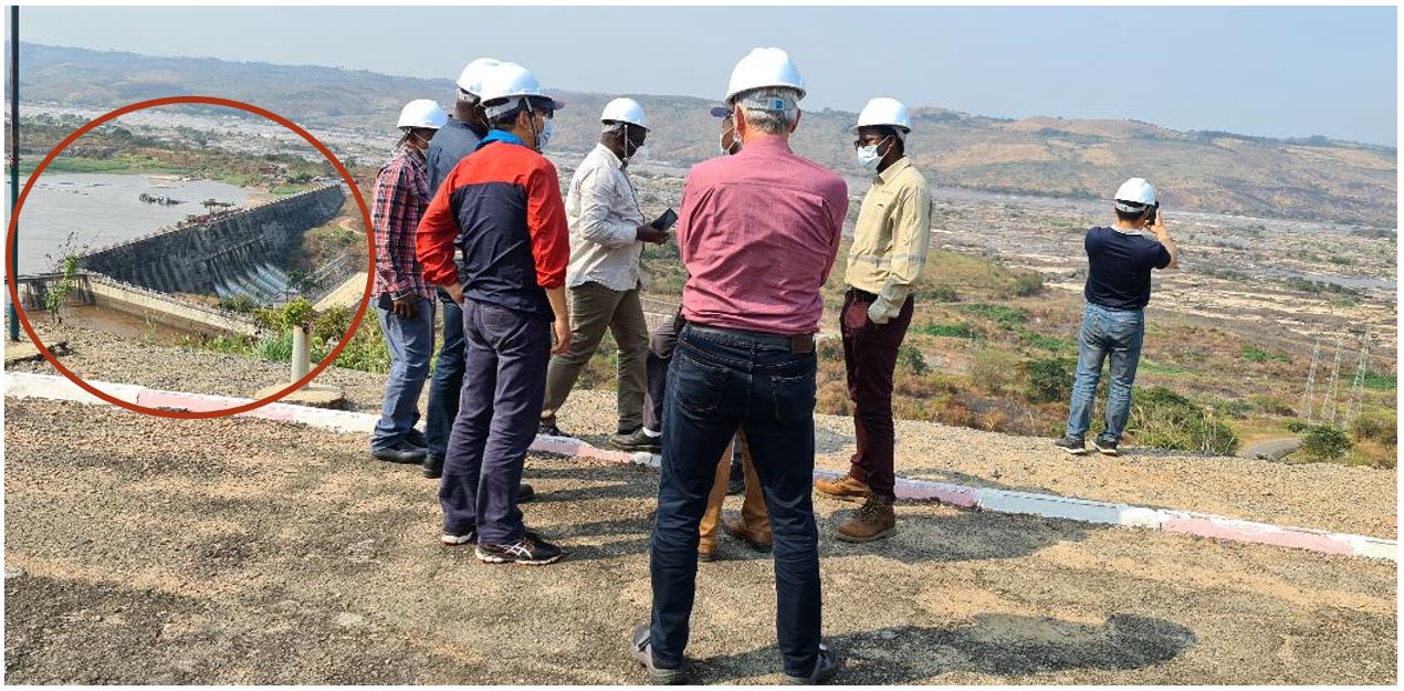 Engineers from Kamoa-Kakula’s Energy company, SNEL, Stucky, Voith and Zijin Mining conducting an inspection of the Inga II hydropower complex. The Congo River, Inga dam, Inga I turbines and the channel feeding water to the Inga II turbines, are circled in red.