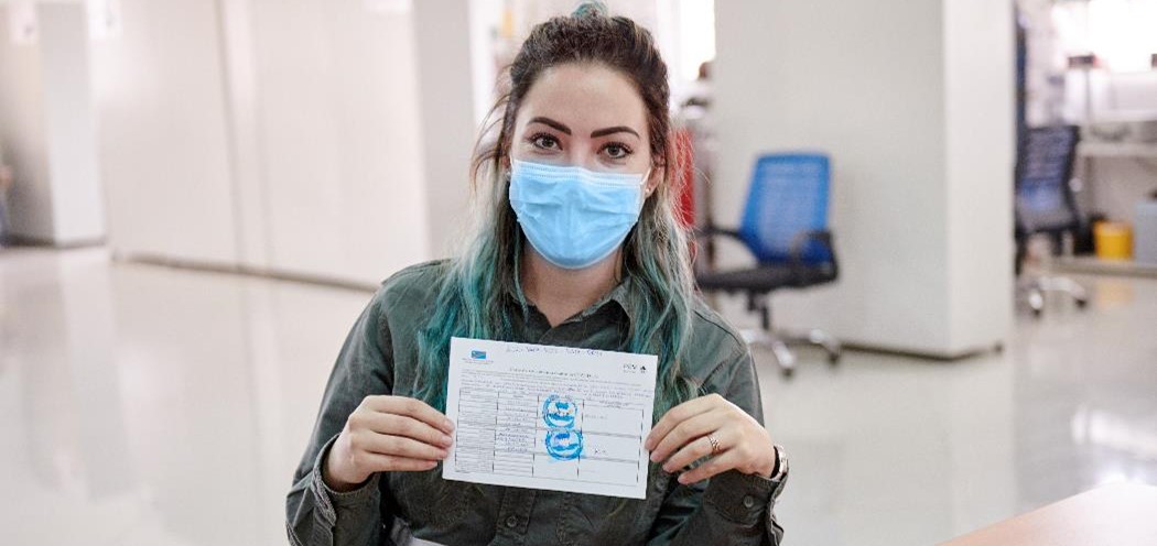 Danielle Morton, Kamoa Copper Reliability Engineer, holding her vaccination certificate after receiving her second vaccination dose.
