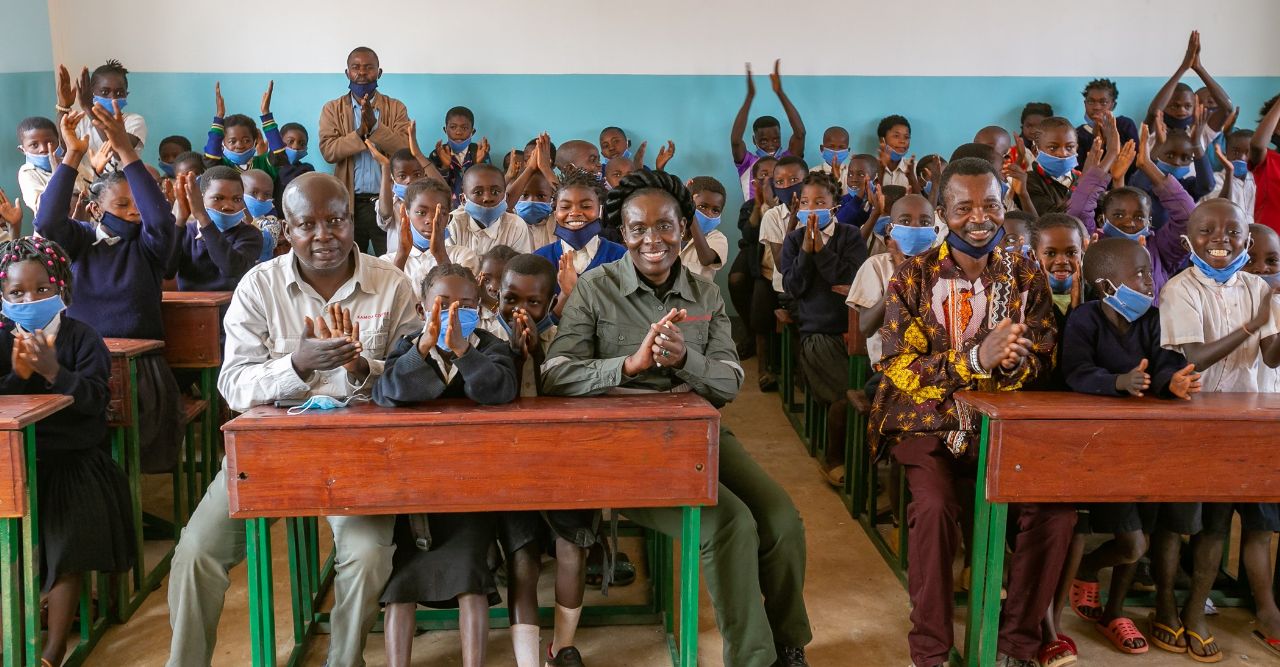 Princess Adèle Kayinda Mahina (centre), Minister of Portfolio, visiting a local primary school that is one of Kamoa Copper’s community initiatives to increase education opportunities for families living near the Kamoa-Kakula Project.
