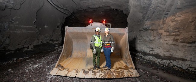 Princess Adèle Kayinda Mahina (left) and Marna Cloete, Ivanhoe’s President and CFO, inside a scooptram bucket during an underground visit of the Kakula Mine.