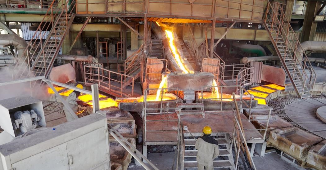 Pouring Kamoa Copper blister ingots, containing approximately 99% copper, at the Lualaba Copper Smelter near Kolwezi, Democratic Republic of Congo.